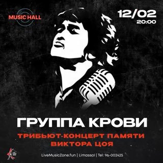 🎸В память о Викторе Цое Мюзик Холл проводит трибьют-концерт, полностью посвященный творчеству Виктора и группы КИНО, лучшие музыканты Лимассола выступят с известными всем нам песнями, перенеся зрителей в славные дни расцвета Ленинградского Рок Клуба!🎙️